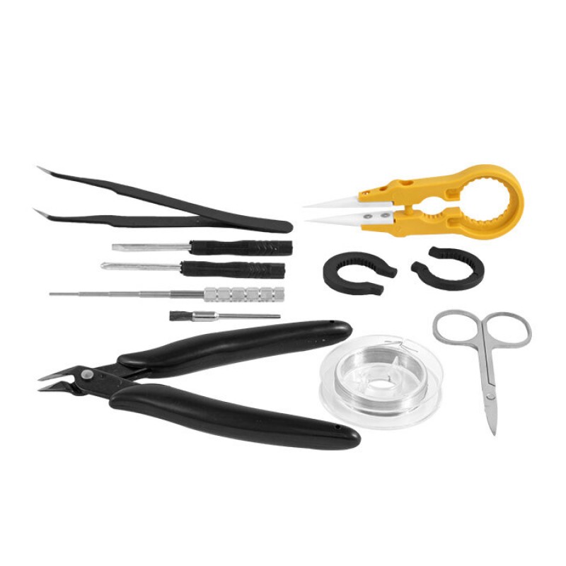 Neben einer Schere sowie zweier Pinzetten findet man hier auch eine praktische Wickelhilfe, mit der schnell und präzise eigene Coils erstellt und mit einem entsprechenden Tool überstehende Drähte abgetrennt werden können.