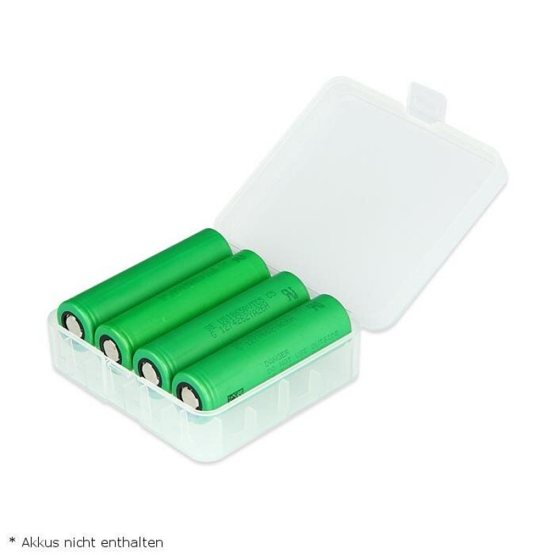 Praktische Kunstoffboxen für den schonenden Transport der gängigsten Akkus. Ein Abreiben der Akkuisolierung wird von stabilen Bögen am Boden der Box zuverlässig verhindert. In die Box passen wahlweise vier 18650er oder zwei 26650er Akkus.