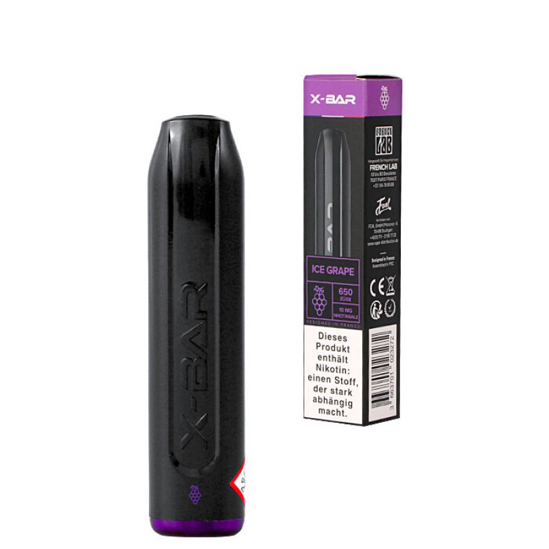 Features:Technische Daten:Elegantes DesignMaterial: PCTGSchwarzes GehäuseMaße: 102 x 23 x 13mmFederleicht und transportabelFüllvolumen: 2mlPraktische ZugautomatikNikotingehalt: 10mg/mlAuf MTL-Dampfen ausgelegtBatterie: 500mAh (Inbuilt, nicht aufladbar)Akkuanzeige: via LEDInhaltsstoffe:Glycerin, Propylenglykol, versch. Aromen, Nikotin (10mg/ml)Lieferumfang:1x X-Bar Disposable Kit 10mg (je nach Auswahl)1x Bedienungsanleitung